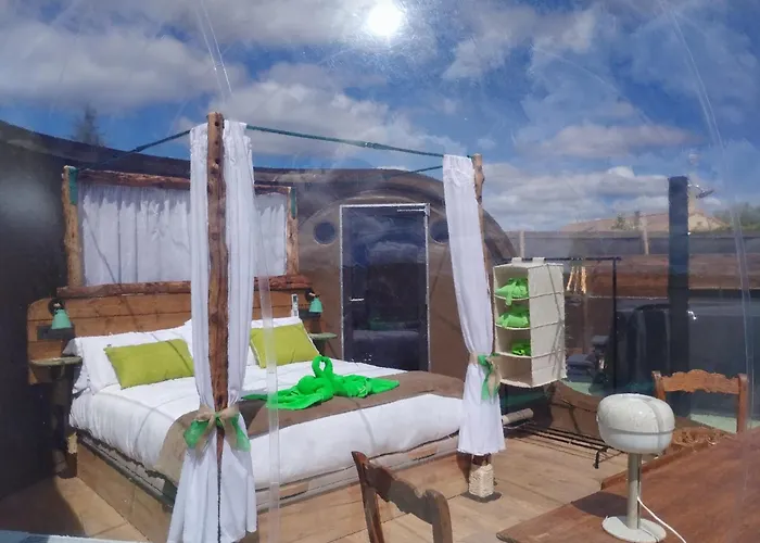 Cosmoveros - Hotel Burbuja destaca por sus experiencias únicas con alojamientos de burbuja y bienestar. Ofrece vistas montañesas impresionantes junto a un restaurante que sirve cocina vegetariana y vegana. Los huéspedes pueden disfrutar de una bañera de hidromasaje y un centro de salud en el lugar. A solo 36 km de la Plaza Mayor, se presenta como una opción ideal para aquellos que desean relajarse y explorar la belleza de Pedraza. Dispone de conexión Wi-Fi gratuita y actividades como senderismo disponibles en el entorno.